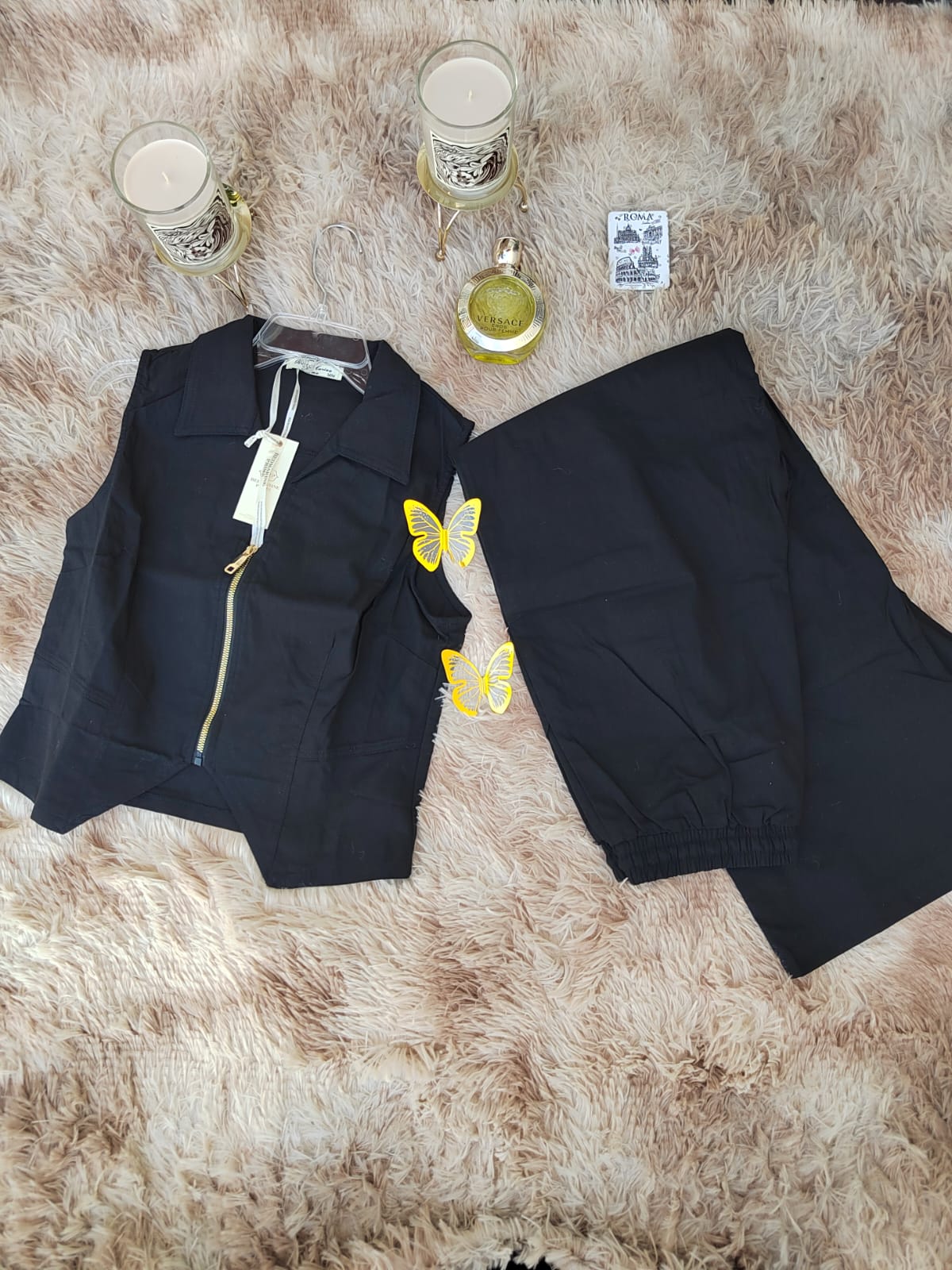 Conjunto negro con top sin mangas, cuello camisero y cierre dorado, acompañado de pantalón tipo jogger con pretina elástica. Moderno, versátil y cómodo.