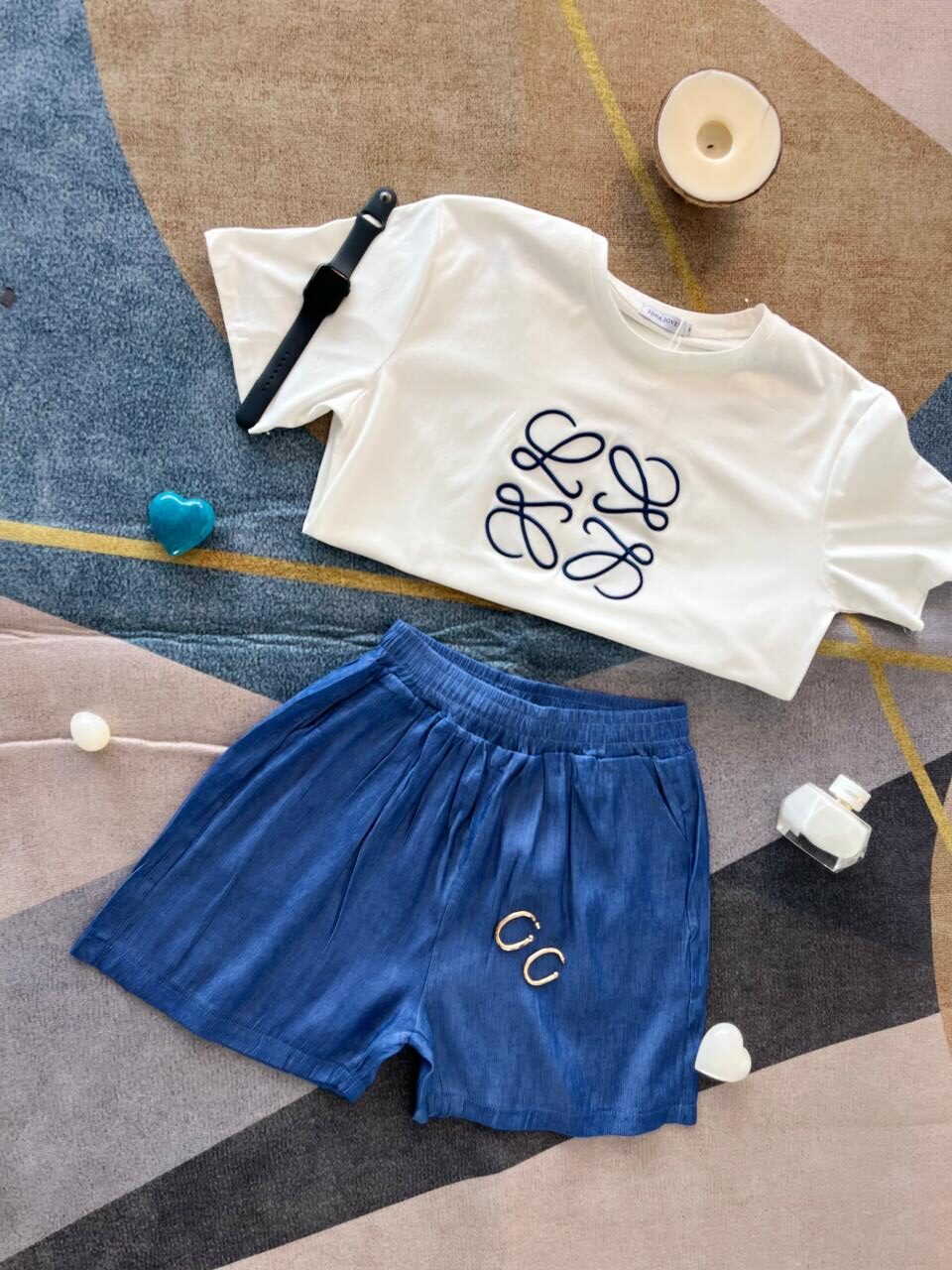Este conjunto combina comodidad y elegancia en un look moderno y versátil. La blusa blanca de algodón destaca con un bordado sofisticado en azul marino tipo monograma, que aporta un aire clásico pero contemporáneo. Su corte es recto y ligero, ideal para los días cálidos. El short azul plisado, con cintura elástica, es suave al tacto y fluido, lo que brinda una silueta femenina sin perder comodidad. Perfecto para salidas casuales, paseos de fin de semana o un brunch con amigas. Añade tus accesorios favoritos y estarás lista para brillar sin esfuerzo.