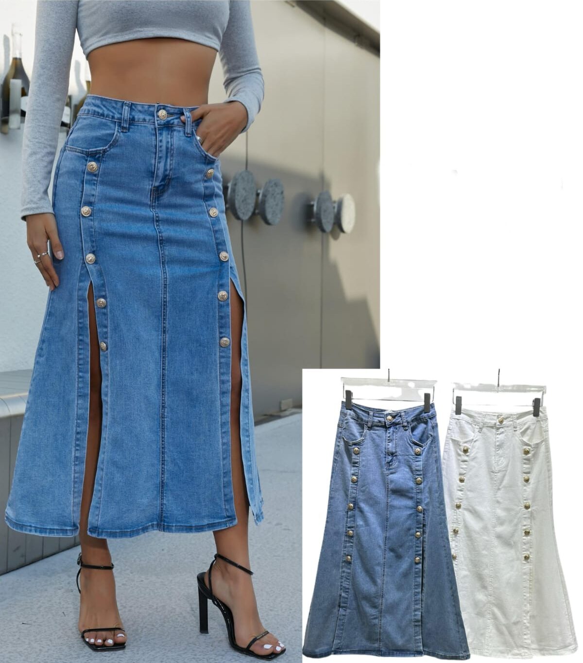 Diseñada para resaltar tu estilo con actitud y elegancia, esta falda midi de mezclilla se roba todas las miradas con sus dos aberturas frontales que aportan movimiento y un toque atrevido. Los botones metálicos decorativos a lo largo de las aberturas no solo alargan visualmente la silueta, sino que le dan un acabado moderno y sofisticado. Confeccionada en denim suave y resistente, cuenta con bolsillos delanteros funcionales y un corte ligeramente en “A” que favorece la figura. Disponible en azul clásico y blanco hueso, es ideal para combinar con tops ajustados, básicos o blusas statement.